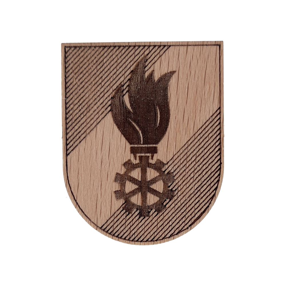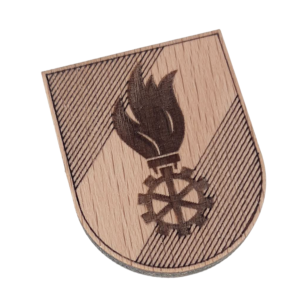 Das Holzteile des Wappens besteht aus naturbelassenem Holz (Buchensperrholz) von möglichst lokalen Produzenten und Lieferanten.